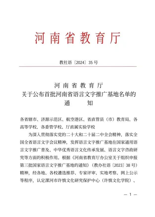 近日,河南省教育厅公布了首批河南省语言文字推广基地名单,漯河市许慎文化研究与保护中心(许慎文化学院)成功入选。