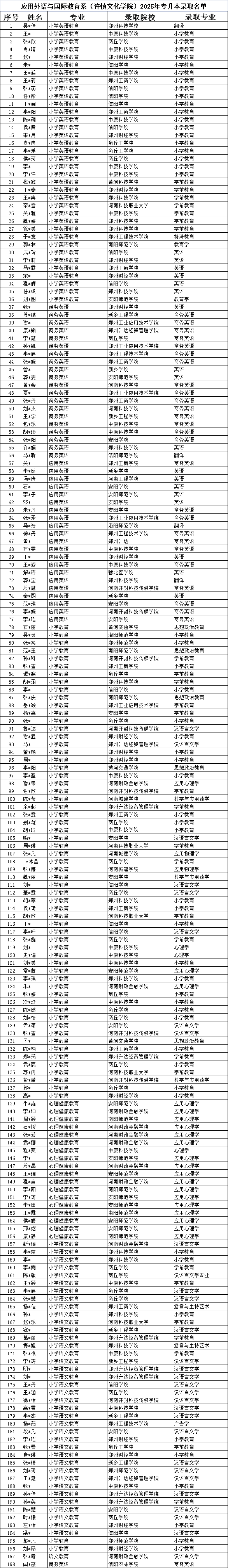 春风传捷报,金榜映初心。河南省2025年普通高校专升本录取工作圆满结束。我系学子以“破竹之势”再攀高峰,总录取人数达198人,成功进入郑州师范、洛阳师范、南阳师范、河南城建学院、河南科技学院等多所知名学府的大门。在这场升学“攻坚战”中,师生同心、政策赋能,涌现出一批“现象级”班级与个人,用实力诠释了付出就有回报!
