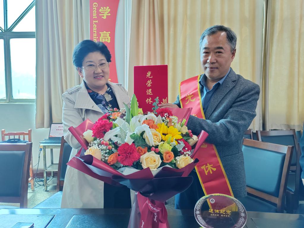 党总支书记寇槐花给潘玉尚老师颁发光荣退休证书