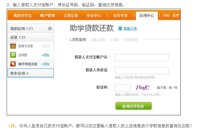 3.返回“我的应用”点击“助学贷款还款”—“我要还款”—在“借款人支付宝账户名”内输入贷款学生还款支付宝账户(在线系统内的还款账户)—输入贷款学生身份证号(贷款系统内身份证号)—输入验证码—点击“查询还贷信息”
