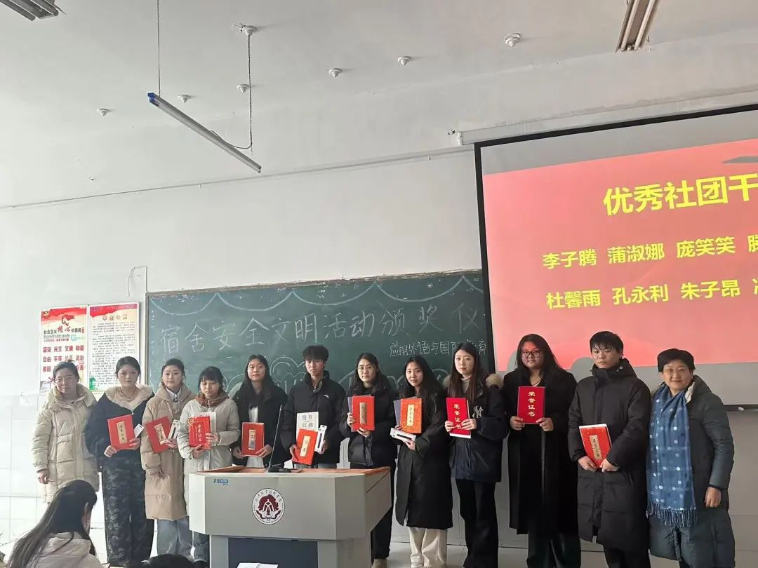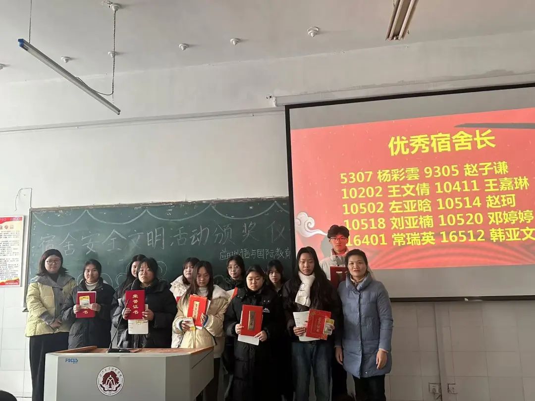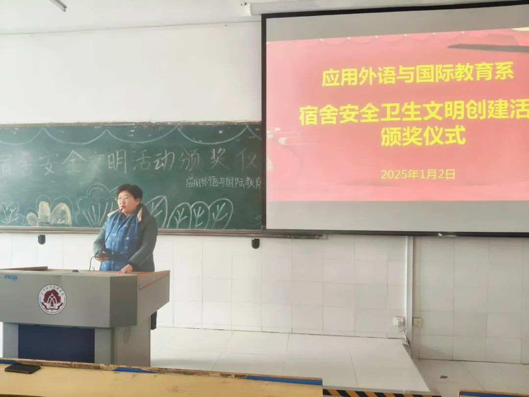 为进一步提高宿舍建设的内涵与质量,营造安全、卫生舒适的学习生活环境,创建更加和谐的宿舍人际关系,1月2日中午,由应用外语与国际教育系主办、系宿管委承办的2024年宿舍“安全、卫生、文明”创建活动颁奖仪式在3号教学楼3104教室举办。系党总支书记寇槐花、系党总支副书记吕红梅、全体辅导员、系宿管委全体成员、宿舍长和全体外宿生参加了颁奖仪式。