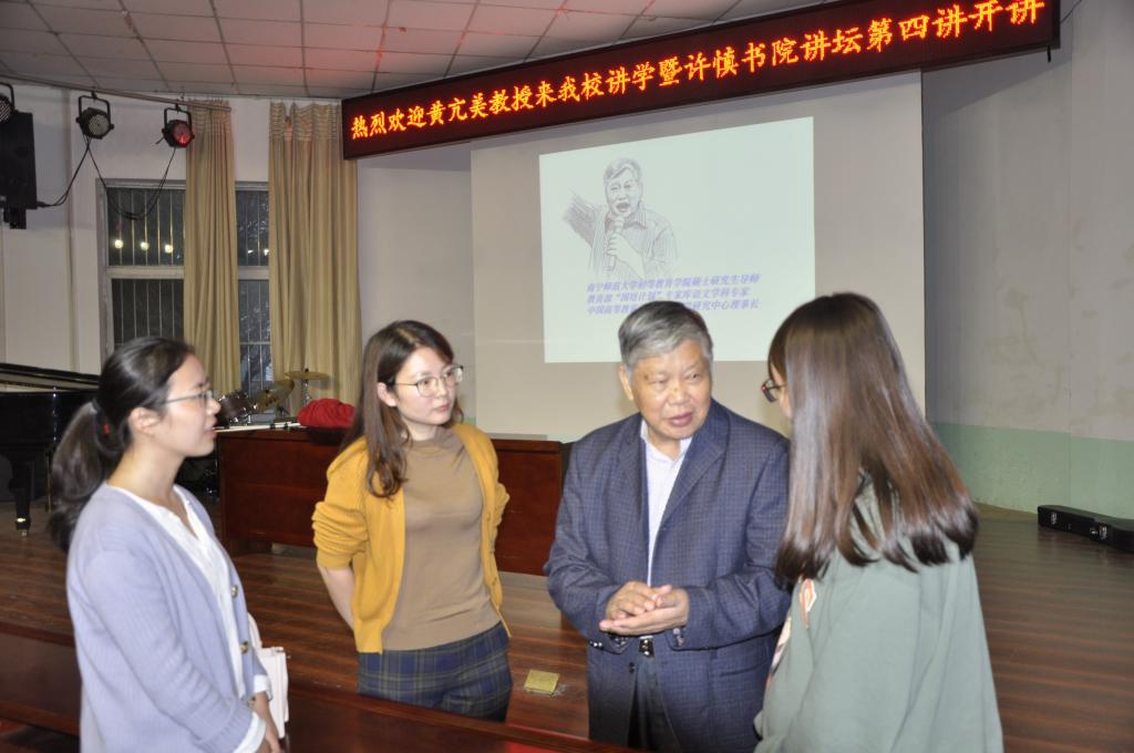 黄教授的讲座深入浅出、层层推进,在形象多样的例证中,引领许慎文化学院的师生们温故知新、以新带旧,细细体会了语文阅读教学中的“三品”。讲座结束后,黄教授与李珍珍、秦敏、王智丹、孙晓芳等四名弟子亲切交谈,关心询问弟子们格律诗的创作近况,嘱咐弟子们潜心向学,争取更上一层楼。