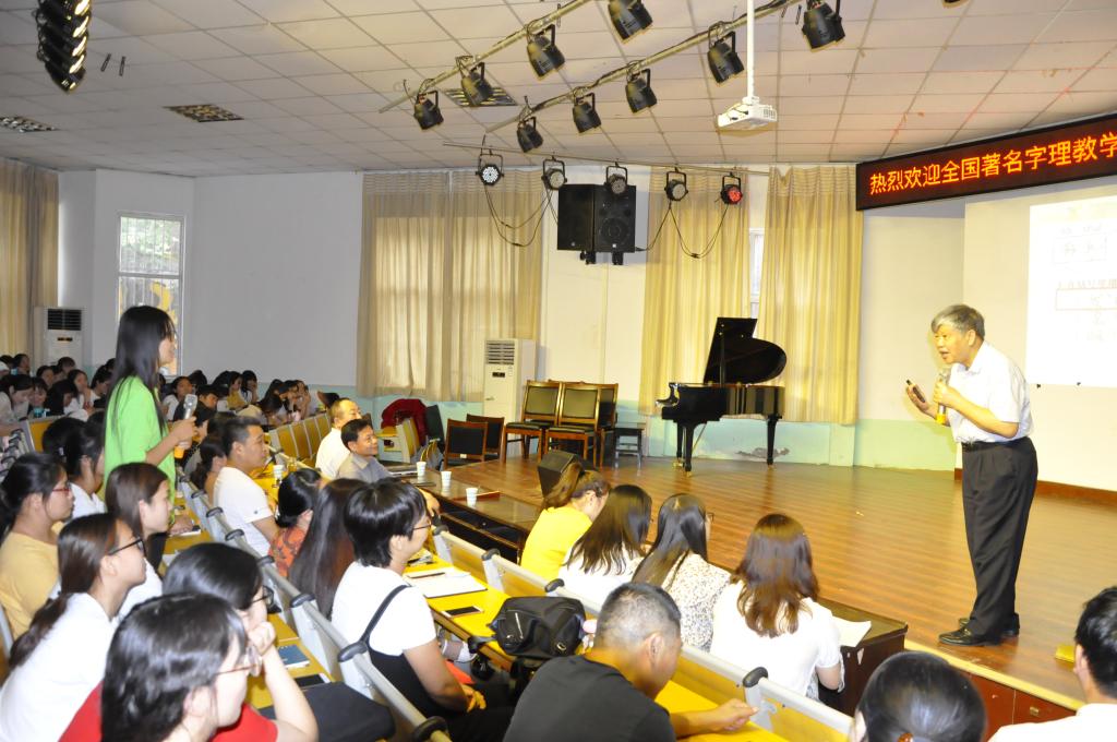 黄教授以小学二年级语文课文《揠苗助长》和《雷雨》为例,以漯河北大附属实验学校小学二年级40多名学生为授课对象,为大家上了两堂生动形象的观摩课,并强调低段阅读课本质上就是随文识字课,汉字教学要“特别关注汉语言文字的特点”,有机地渗透字理教学,以体现“通过字形理解字义,借助字义记住字形”的教学理念。黄教授的演讲十分精彩,台下响起阵阵掌声。