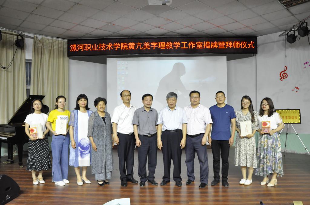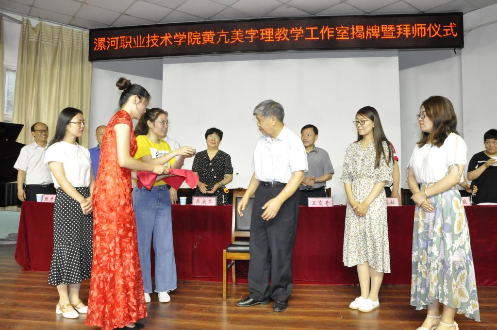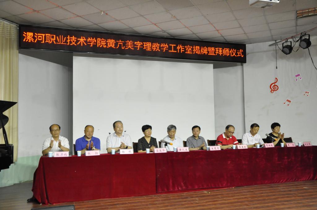 6月11日下午,我院在小礼堂举行黄亢美工作室揭牌仪式暨青年教师拜师仪式。OK138太阳集团副校长王变奇、校工会主席吕爱华、组宣部部长易春林、人事处处长杨曦、教务处处长贾新政、校实验实训中心主任张勃、科研处处长长李杰、许慎文化学院院长张彦鸽、党总支书记寇槐花及许慎文化学院师生代表出席仪式。仪式由教务处处长贾新政主持。 学校工会主席吕爱华首先代表学校领导发表讲话,简要介绍了许慎文化学院的发展现状,高度评价黄亢美教授取得的教学科研学术成果,并强调指出在我校成立黄亢美字理教学工作室并举行弟子拜师仪式对我校许慎文化学院的专业建设和课程教学改革的重要意义。随后,副校长王变奇和黄亢美教授共同揭牌共同为黄亢美工作室揭牌。最后进行了弟子拜师仪式,许慎文化学院李珍珍、秦敏、孙晓芳、王智丹四位老师成为黄亢美教授的第一批弟子,四位弟子表示一定不辜负学校的期望和导师的栽培,虚心向导师学习,不断提升提高自身业务素质。