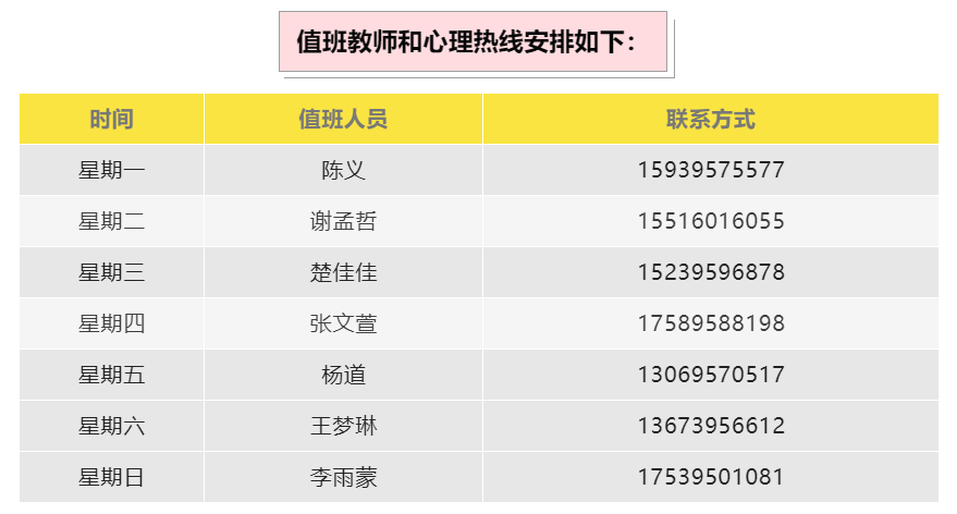 为了守护我院学子的身心健康,做好疫情期大家的心理防护,缓解因疫情封闭管理产生的心理烦躁等问题,我院搭建“学院—辅导员—班级心理委员”三级疫情心理干预机制,将通过心理健康讲座、心理防护知识宣传、新冠肺炎疫情期间心理晴雨表等,为你们供精准的心理援助服务。大家有任何心理难解之谜可随时拨打心理健康值班教师电话。
