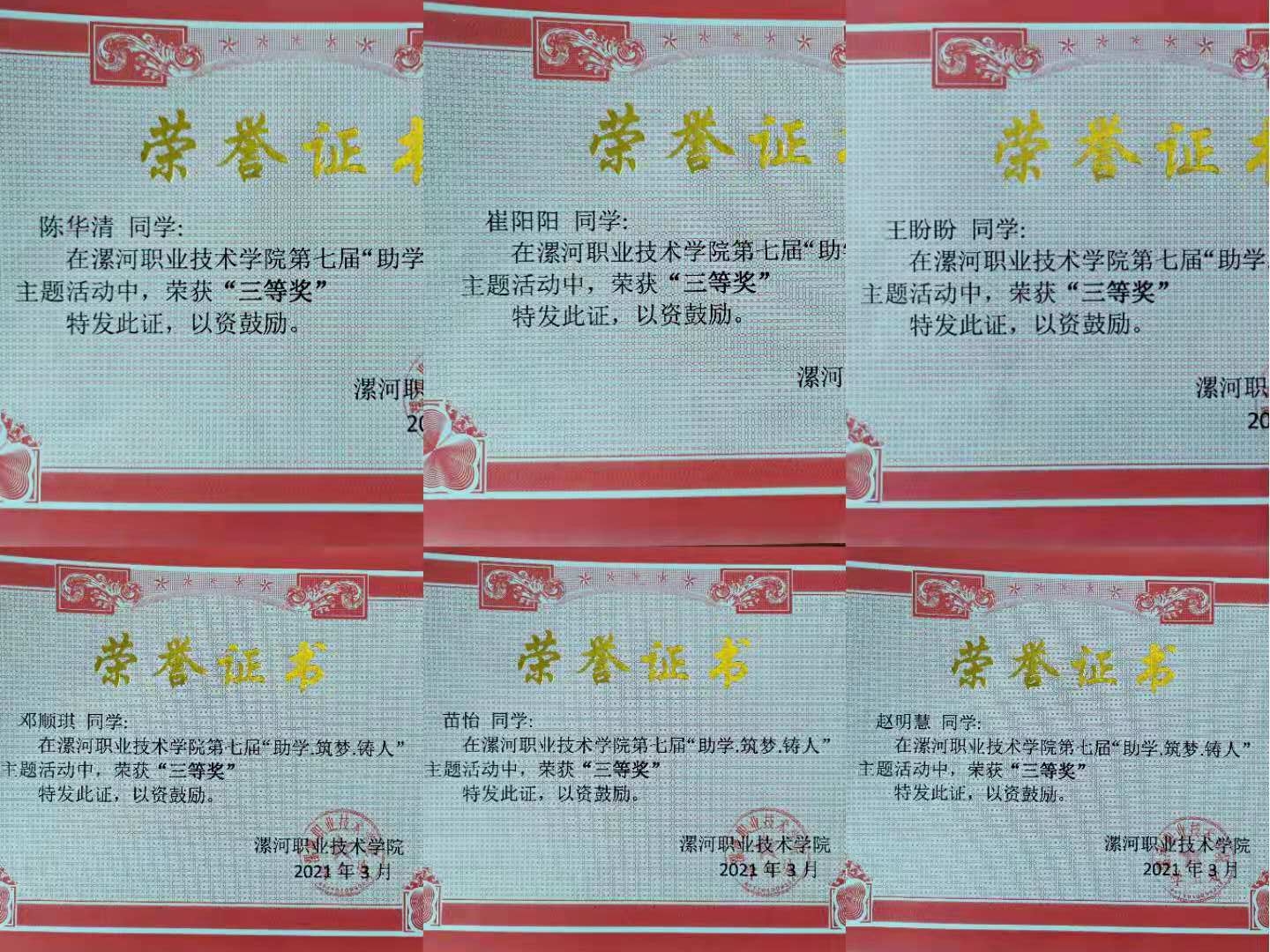 为大力宣传国家学生资助政策及成效,激励广大受助学生奋发自强、立志成才、感恩奉献,教育部全国学生资助管理中心、团中央青年发展部、中国银行、中国青年报社联合举办了第七届“助学·筑梦·铸人”主题活动,我院认真开展宣传活动,积极组织48名学生参加,通过参与短视频制作、图片设计或文字作品等形式,通过学校评选,我院刘昌胜、杨洋两名同学获得一等奖,时瑞遥同学获得二等奖,陈华清、崔阳阳等六名同学获得三等奖。