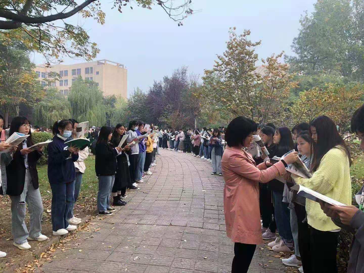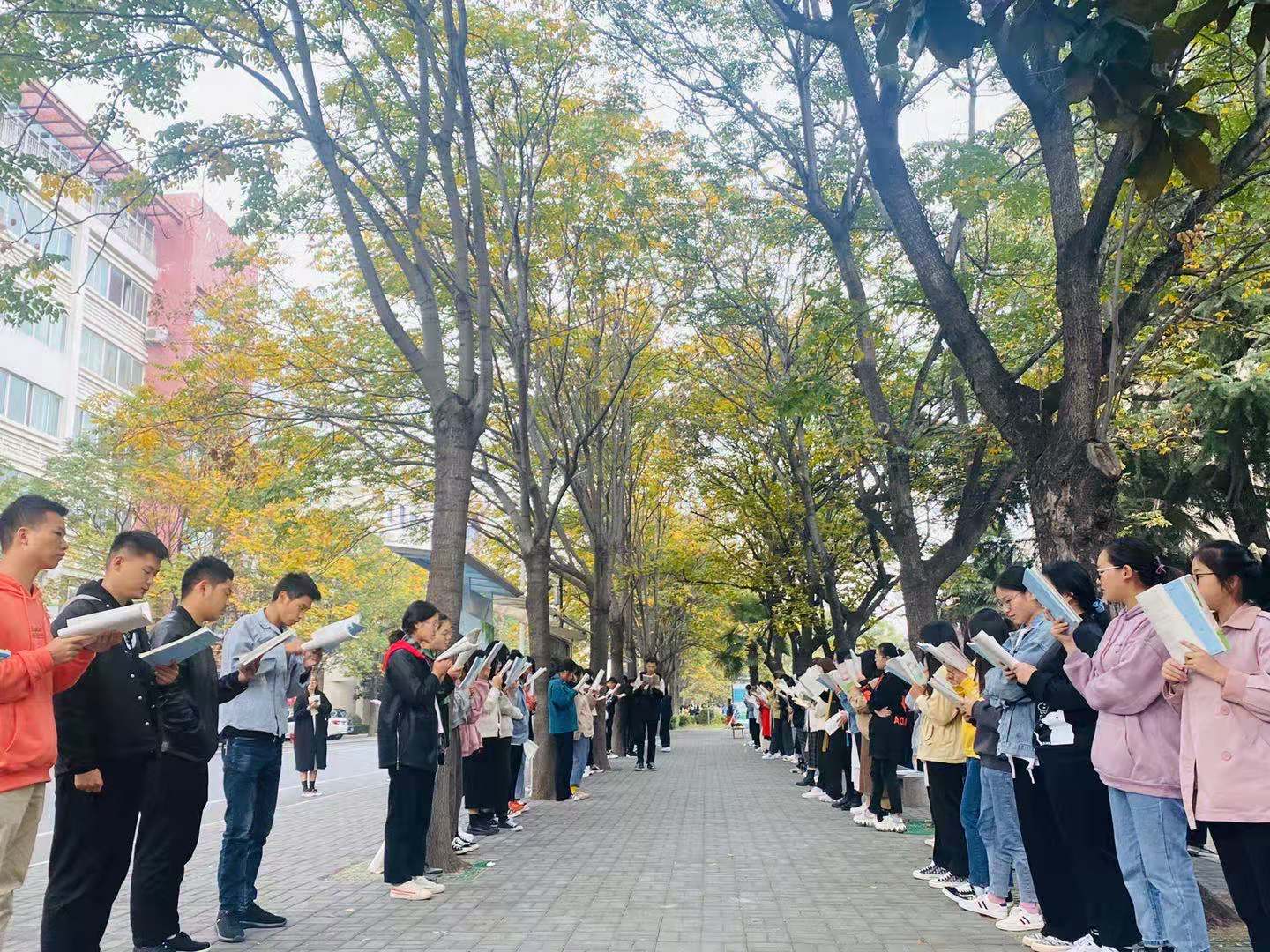 深秋的早晨空气清新,伴有深深地凉意,正是读书的黄金时期,新学期,同学们在辅导员的陪伴中,在学生教官的组织和领读下,全神贯注,放声朗读,在不知不觉中明白文章深蕴,真正做到有所读、有所记、有所学。本学期1100多名新生加入了“经典诵读训练营”,晨读的队伍不断壮大,树荫下,水池旁,操场上,到处都是许慎文化学院学生读书的身影。