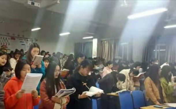 如果有人要问,下雨天“经典诵读训练营”是不是就不进行了呢?偷偷告诉你,到3号教学楼教室找我们吧!早晨3号教学楼的教室早已是灯火辉煌,朗朗的读书声随处可闻。