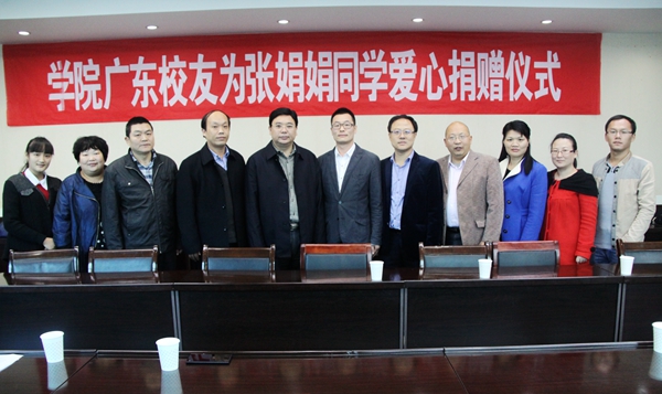 捐赠仪式上,顾文明院长代表学院对广东地区校友关注母校、关爱在校学弟学妹的善举表示高度赞扬。他说,校友们的捐赠将成为张娟娟同学战胜病魔的强大精神力量。作为你们母校的老师,最感欣慰的是桃李满天下,看到同学们在各行各业取得的成就,感到由衷的高兴。校友们不远千里,向患重病的学妹表达爱心,献出情谊,体现了大家对母校的汇报和奉献,祝愿同学们取得事业上更大的成就。