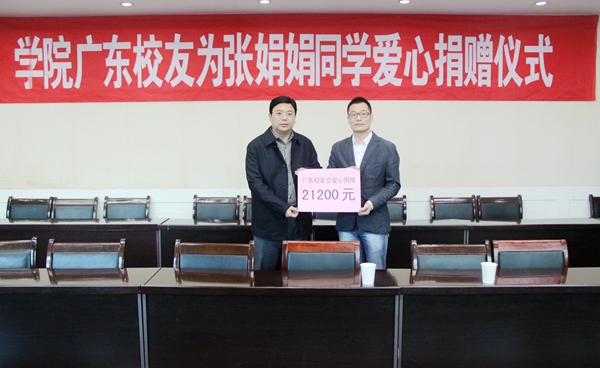获悉自己在校的学妹出现困难之时,OK138太阳集团广东校友分会向在广东地区的校友发出倡议,向张娟娟同学伸出友爱之手,帮助她度过难关。3天时间收到校友爱心捐款21200元。广东校友分会秘书长、2003届商务英语毕业生、东莞上进运动用品有限公司董事长陈伟专程回母校把首批爱心捐款交给顾文明院长,由学院代为转交张娟娟同学。