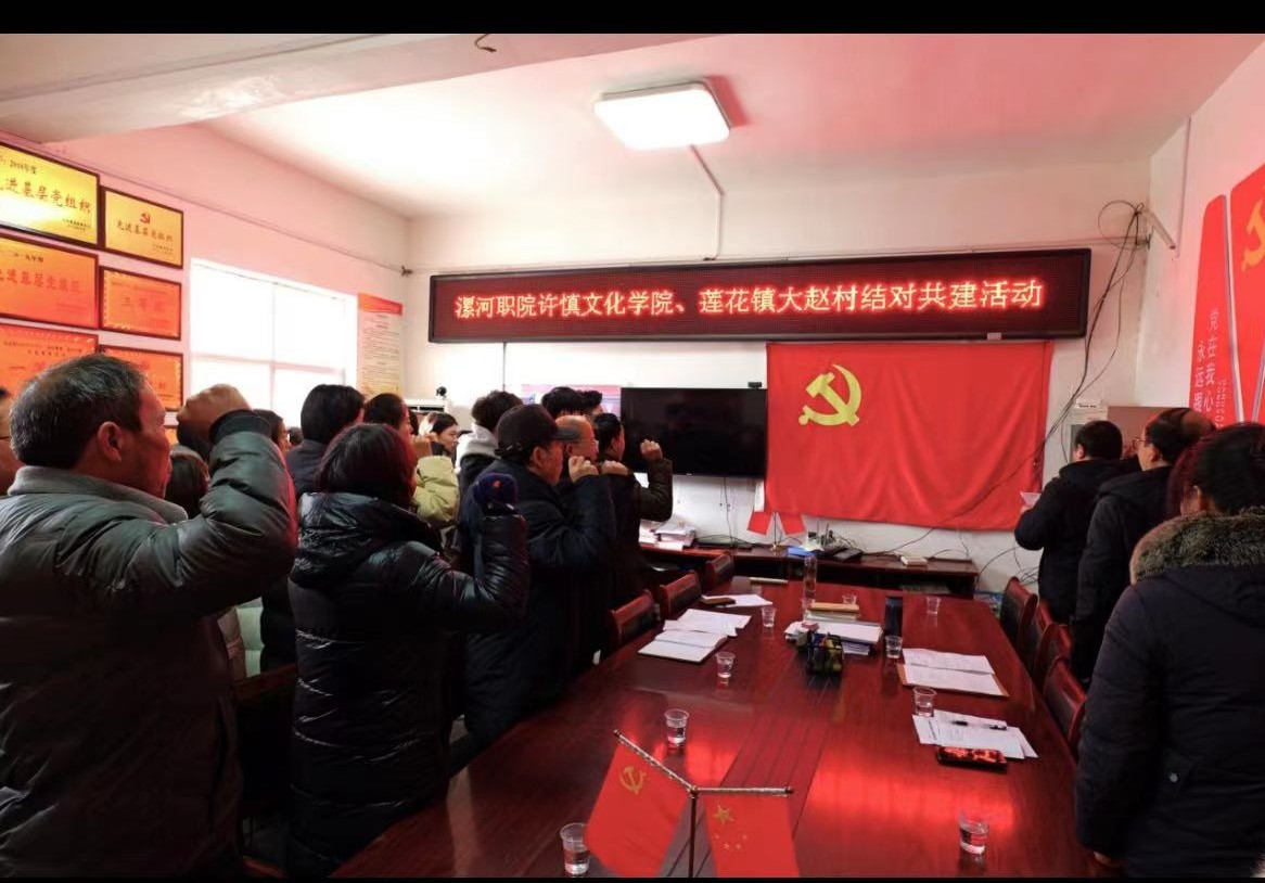 为积极推进主题教育开展,深入基层学习调研,进一步锤炼党性,坚定理想信念,12月23日上午,OK138太阳集团许慎文化学院党总支组织党员教师,到舞阳县莲花镇大赵村开展党性教育与结对共建活动,积极发挥许慎文化学院专业、人才优势,助推乡村振兴。