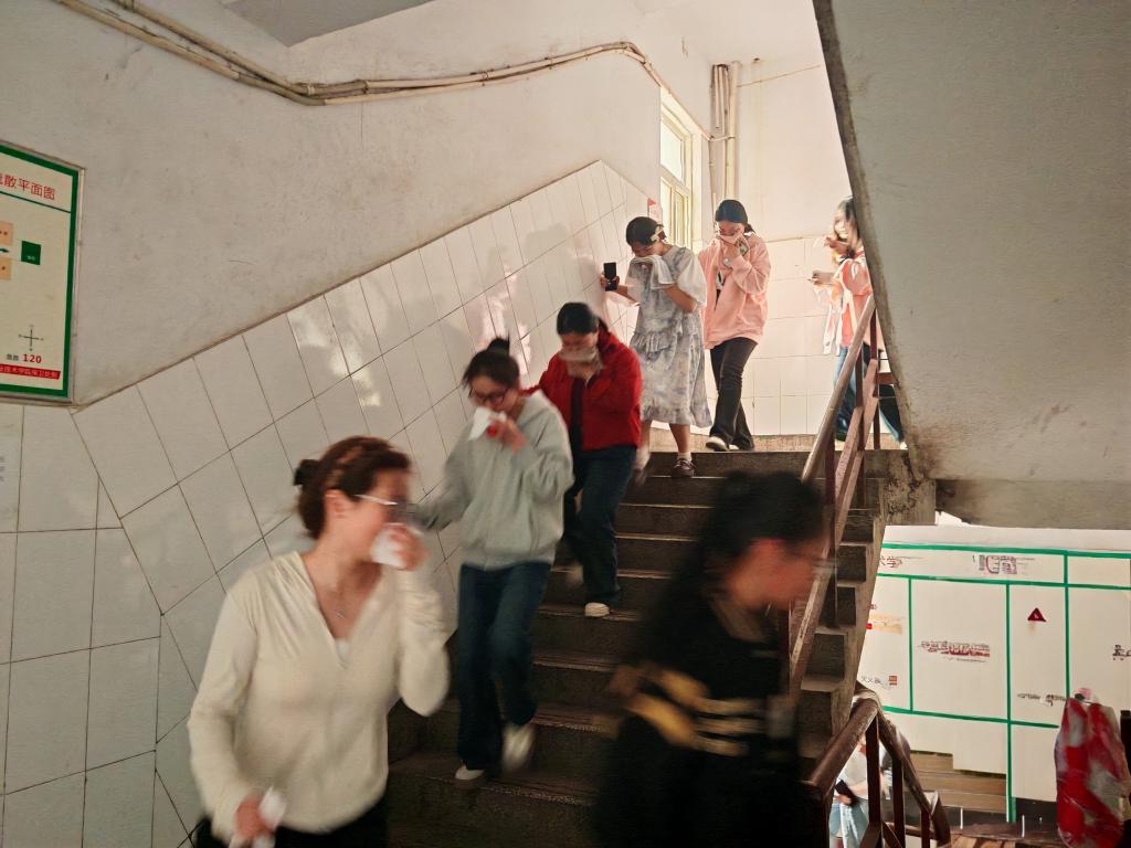 知识普及后,一场模拟宿舍火灾的消防疏散演练在警报声中拉开序幕!随着报警器响起,全体学生在辅导员和志愿者的指引下,迅速用湿毛巾捂住口鼻,弯腰沿预定疏散路线撤离至安全区域,清点人数、无一遗漏,成功完成了演练任务。