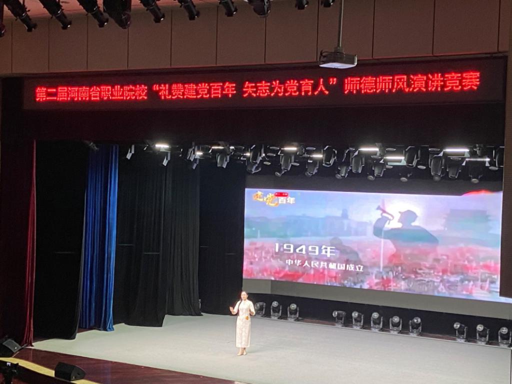 在刚刚落幕的河南省教育厅主办的第二届河南省职业院校“礼赞建党百年 矢志为党育人”师德师风演讲竞赛高职组决赛中,她以过硬的职业素养和良好的教师形象荣获二等奖。她就是我校“十佳个人”、“优秀党员”——崔艳丽老师。