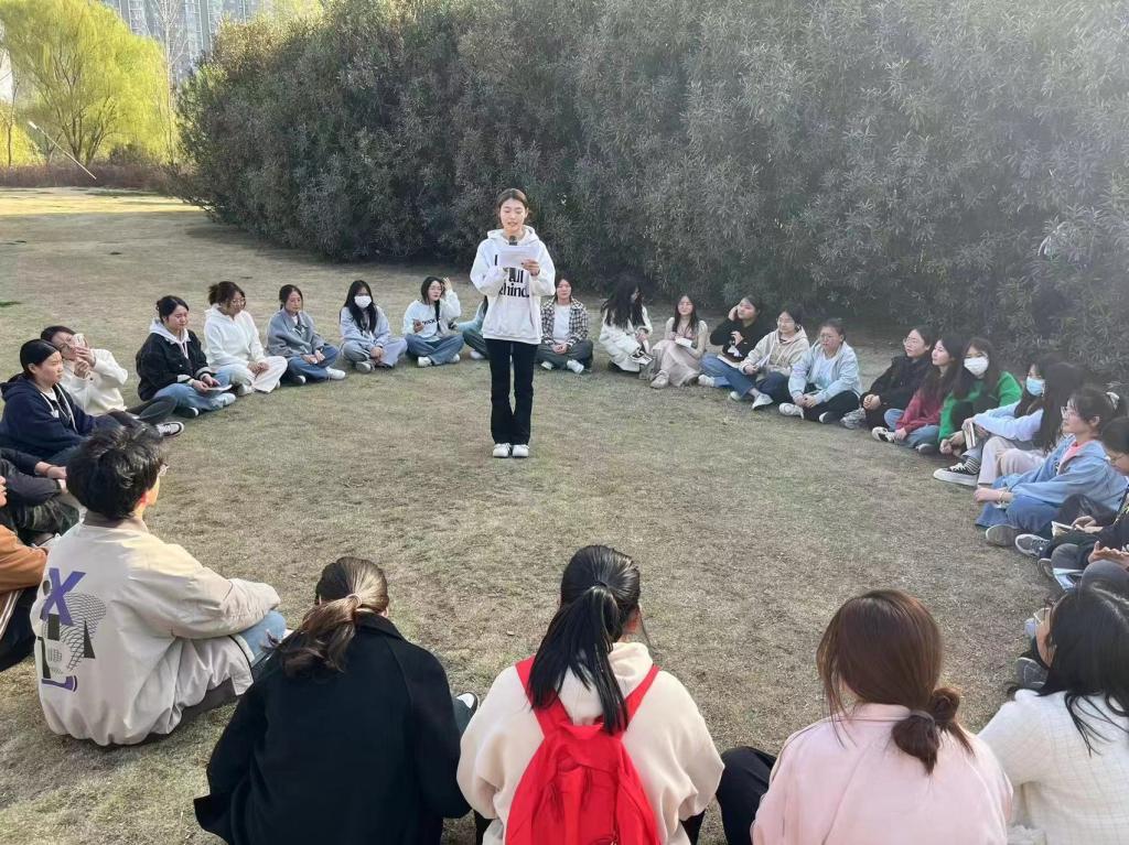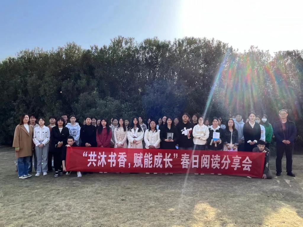 春暖花开正是读书季,为推动“书香校园”建设,引导激励广大师生爱读书、读好书、善读书,在系党总支的指导下,应用外语与国际教育系团总支在全系范围内充分宣传发动,提高全体学生每日站立式晨读的阅读素养,组织45名青年学生代表积极参与我系和学校图书馆共同组织开展的“共沐书香,赋能成长”春日阅读分享活动。2024年3月21日下午,在图书馆王晓华、杨晓东、王睿佳老师及应用外语与国际教育系吴亚凭、白玉秋老师的带领下,同学们在沙澧河风景区草坪处举办了一场别具特色的春日读书分享会。