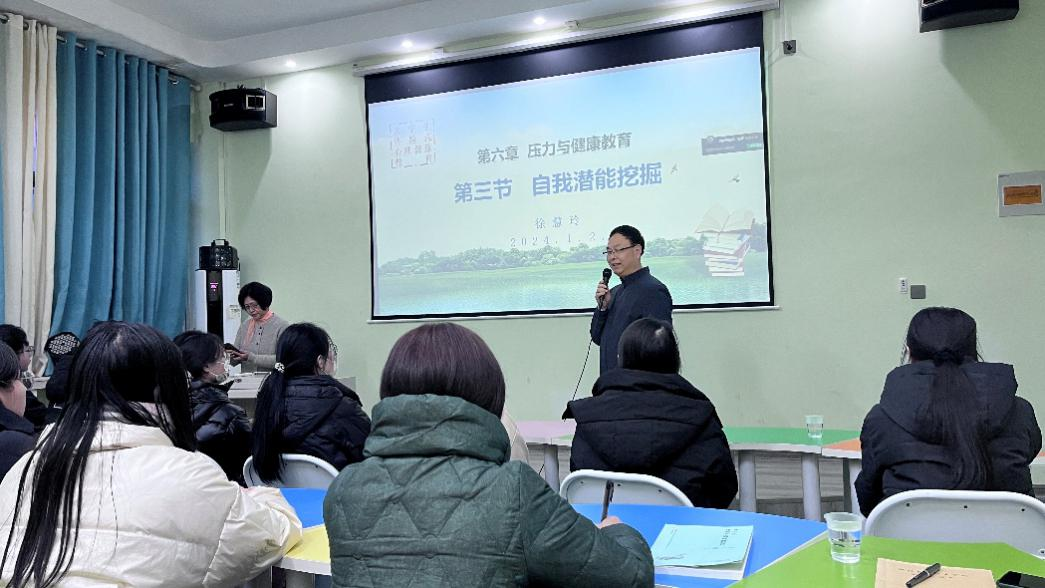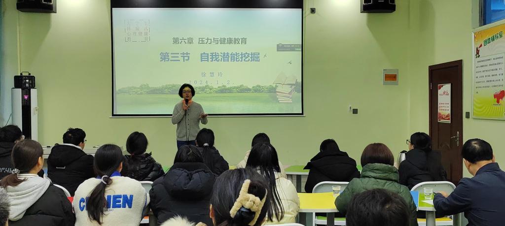 徐慧玲教授结合自己丰富的教学经验,为大家分享了《大学生体验式心理健康教育》课程建设的经验与心得。她说,“体验式课堂是师生在生命深处相遇,教学不仅要使学生获得知识和技能,更重要的是要促进学生心理健康更好的发展”。随后,徐慧玲教授以《自我潜能挖掘》为主题,为大家呈现了一堂精彩的体验式心理学教学示范课。徐教授将课程设计为心理健康知识、心理活动体验、体验感悟分享三个部分,为大家讲解了潜能、成就目标理论、最近发展区等心理学知识,设计了放松冥想、食指力量等体验环节,最后大家积极分享感悟。徐教授在授课中引导教师和学生们参与教学的全过程,激发了大家的学习兴趣,也让教师和学生们对在大学生心理健康教育中的体验式教学有了更深层次的认知。