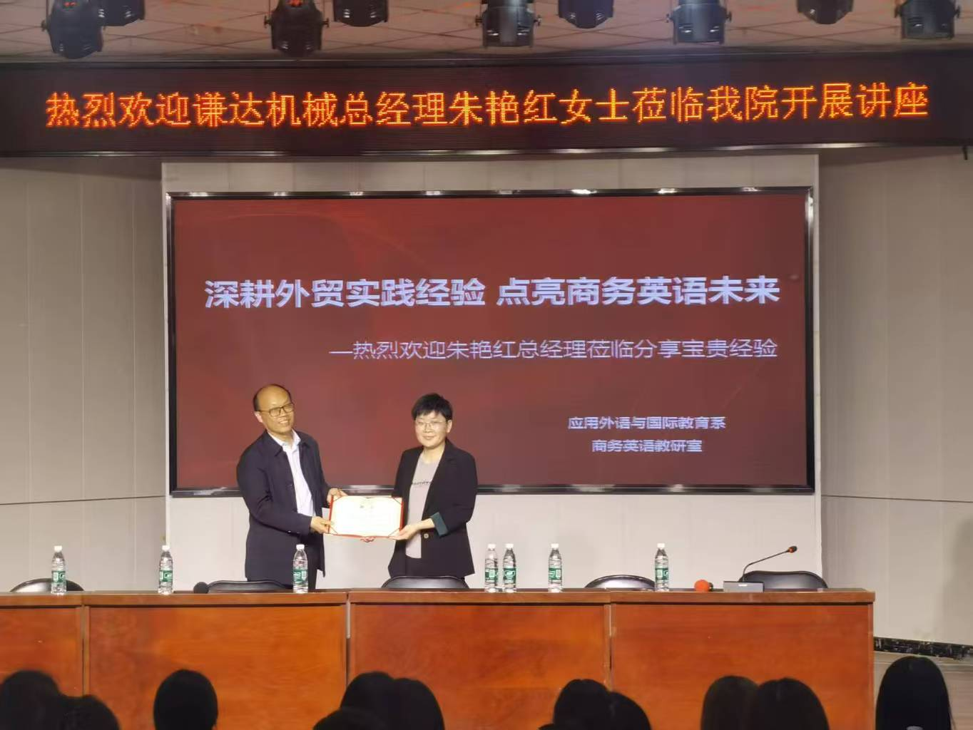 4月23日下午,许慎文化学院成功举办"外贸行业发展趋势与职业机遇"专题讲座。活动特邀河南谦达机电设备有限公司资深经理朱艳红担任主讲,为2023级、2024级商务英语专业210余名师生带来一场理论与实践并重的行业盛宴。许慎文化学院张彦鸽院长为朱艳红经理颁发商务英语专业企业导师聘书。