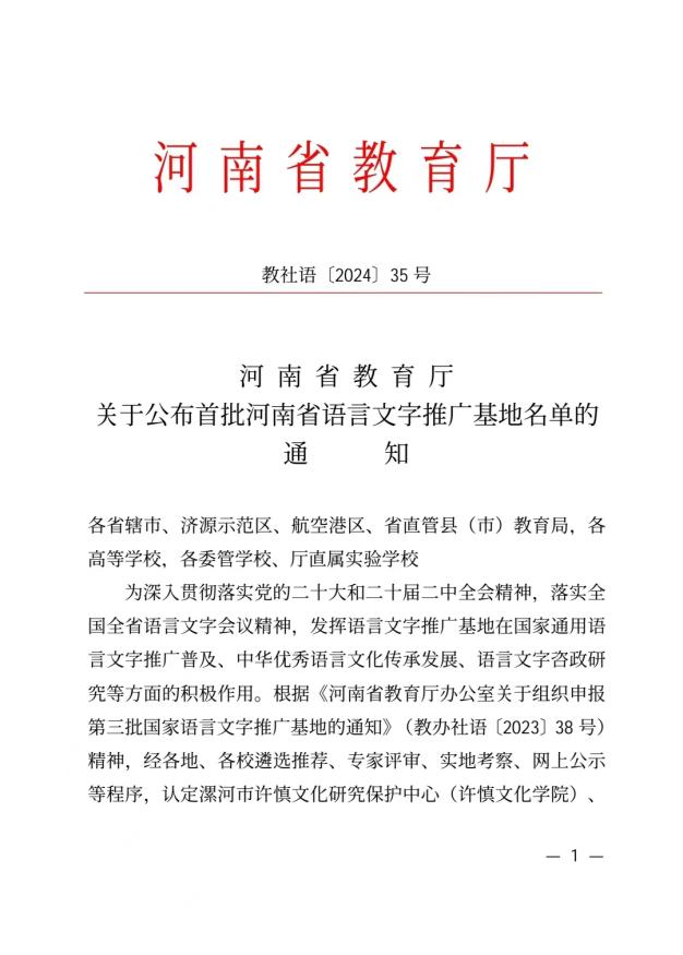 近日,河南省教育厅公布了首批河南省语言文字推广基地名单,漯河市许慎文化研究与保护中心(许慎文化学院)成功入选。